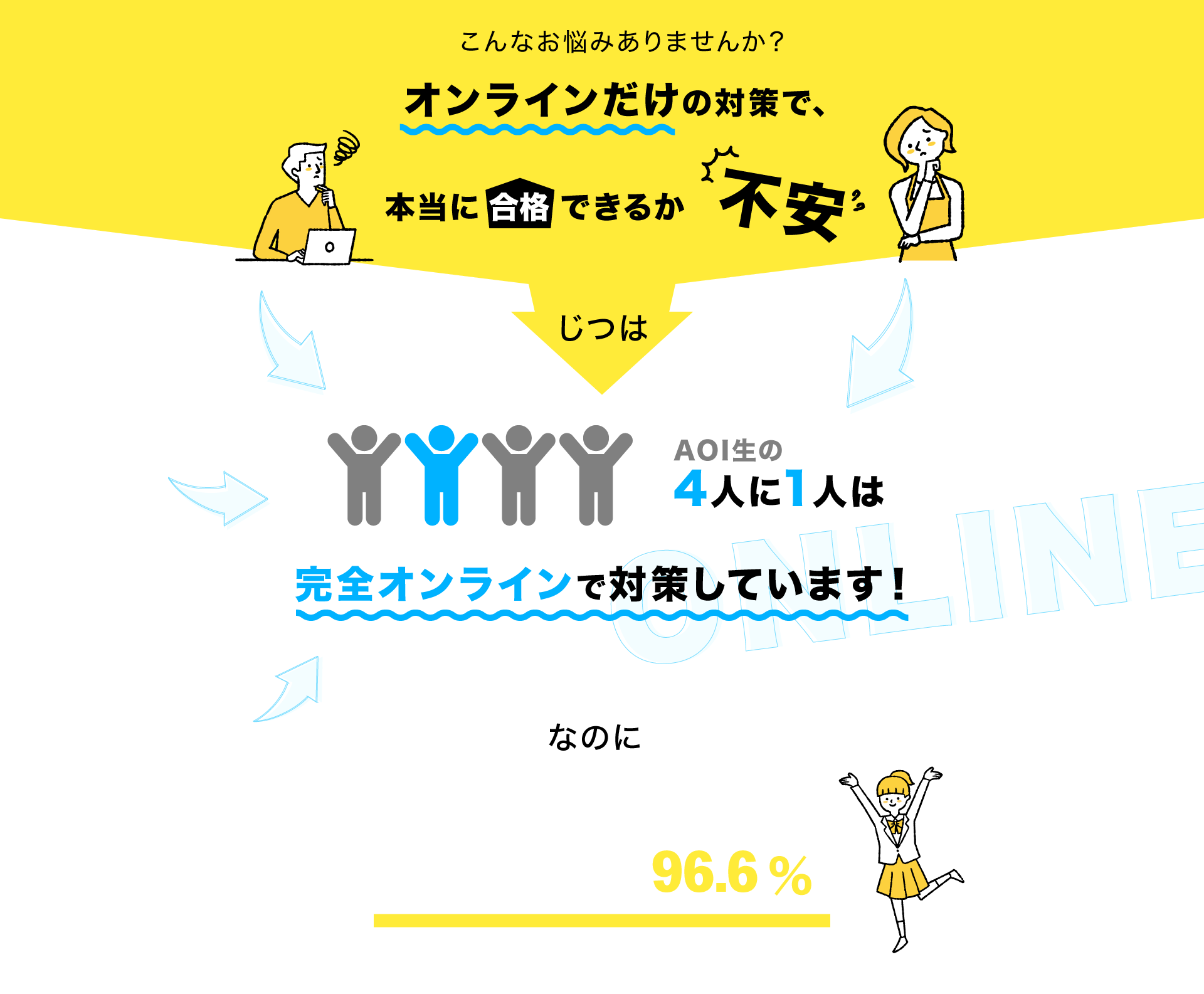 生徒のやる気を引き出し、継続させるオンライン授業を提供いたします 苦手科目があって共通テストで志望校に入るのは難しそう。定期テストの順位があまりよくない。